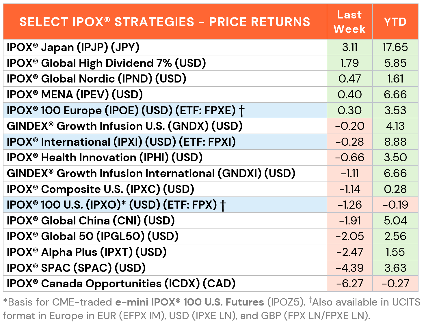 BIG SURGE IN IPOX® JAPAN (IPJP) & MENA (IPEV) PROPELS INTERNATIONAL (ETF: FPXI): Ranking top of the list amongst the IPOX® Strategies was the IPOX® Japan (IPJP), which soared +3.11% to +17.65% YTD, a massive +1303 bps ahead of the Japanese market as measured by the Tokyo Stock Price Index (TOPIX). Here, the portfolio benefited from its tilt towards semiconductor-related exposure, firms in critical industries, and highly liquid large and recently listed firms including Kioxia (285A JP: +23.22%), Advantest (6857 JP: +8.39%) and Rakuten Bank (5838 JP: +3.24%). We also note another exceptional week for travel-related exposure, including cruise line operator 04/24 IPO Viking Holdings (VIK US: +5.27%) and 07/24 IPO LATAM Airlines (LTM US: +3.44%), which both closed out the trading week at a fresh weekly all-time high. This helped propel the IPOX® International (ETF: FPXI) to a gain of +8.88% YTD, outpacing the MSCI World ex. US (MSWOU) by +420 bps during the month. In the IPOX® Europe (ETF: FPXE), corporate updates and strong momentum propelled French TV giant and 12/2024 Spin-off Canal+ (CAN LN: +16.50%) as well as Ben & Jerry’s maker Magnum Ice Cream (MICC NA: +5.44%) to close at a fresh post-listing high.